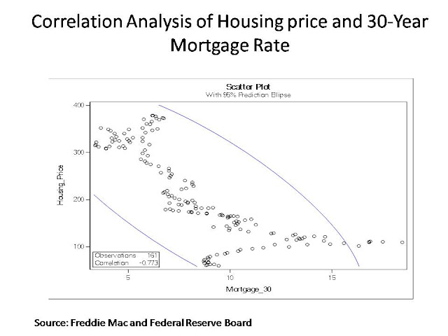 The following chat illustrates the correlation analysis of two variables: Housing price and 30-Year Mortgage Rate. The coefficient of correlation is -0.773 which implies that the relationship is highly negative correlated.